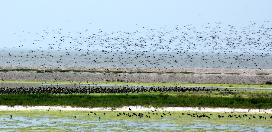 Das Bild oben ist etwas mehr als 20 Jahre alt, d.h. es stammt aus der Zeit des Beginns der WKA-Installation. Solche Vogelschwärme waren normal, von Gänsen über Kiebitze, Austernfischer, Knutts bis hin zu FRegenpfeifern und weiteren. Heute muss ich ein leeres Bild präsentieren. Von den Vogelschwärmen ist nichts geblieben. Es sind nicht nur einzelne Arten verschwunden, ganze Vogelfamilien sind hier nicht mehr zu beobachten. Alle weg bis auf ein paar Einzelexemplare.